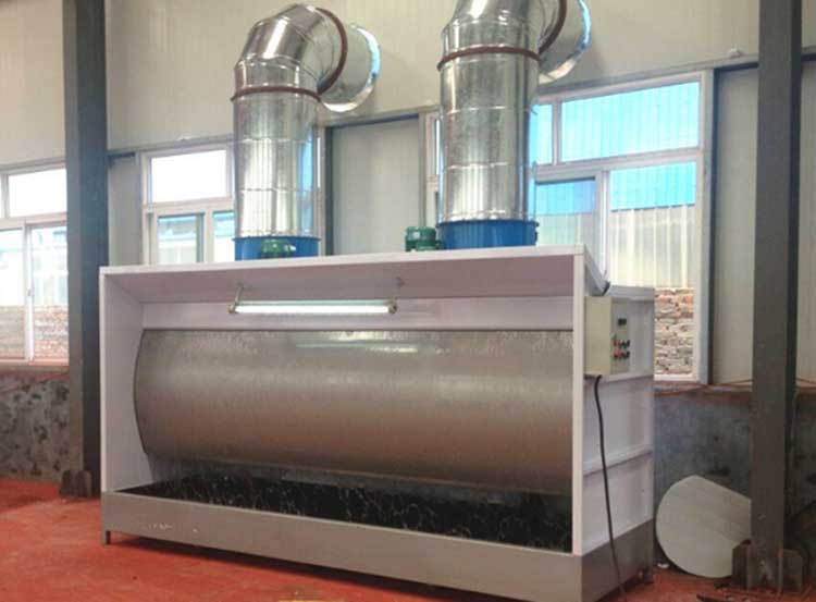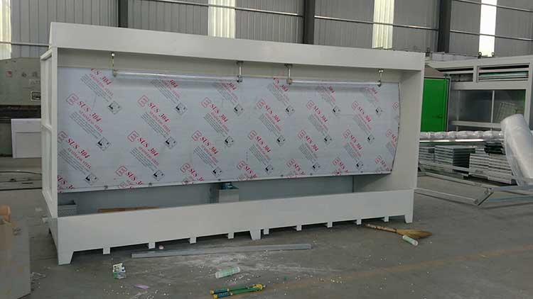 3.2、二是漆霧捕捉系統:采用外水幕厚度0.6mm的201不銹鋼,兩個水槽,兩層內擋板組成的2級水簾漆霧捕捉系統,捕捉漆霧中的顆粒狀涂料成分。水幕形成的水膜能吸附空氣中顆粒狀固體雜質,2級水幕對進入內風道的空氣進行除塵。內風道內,由于氣流轉向形成渦流,