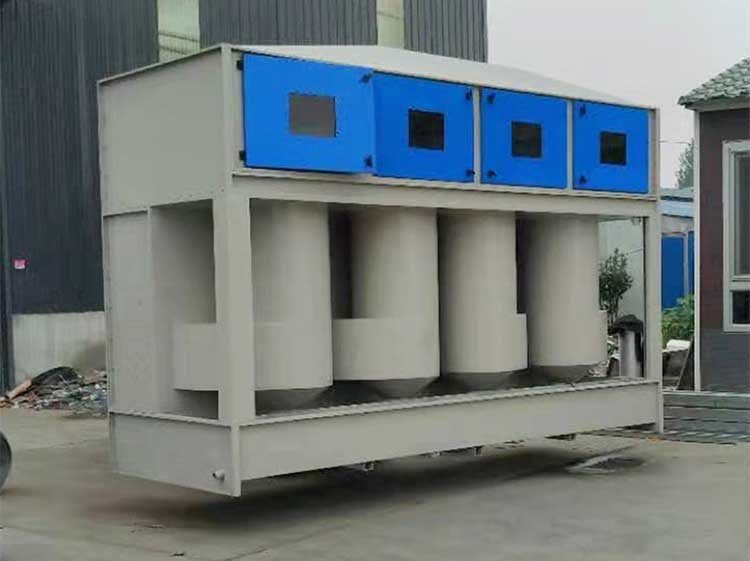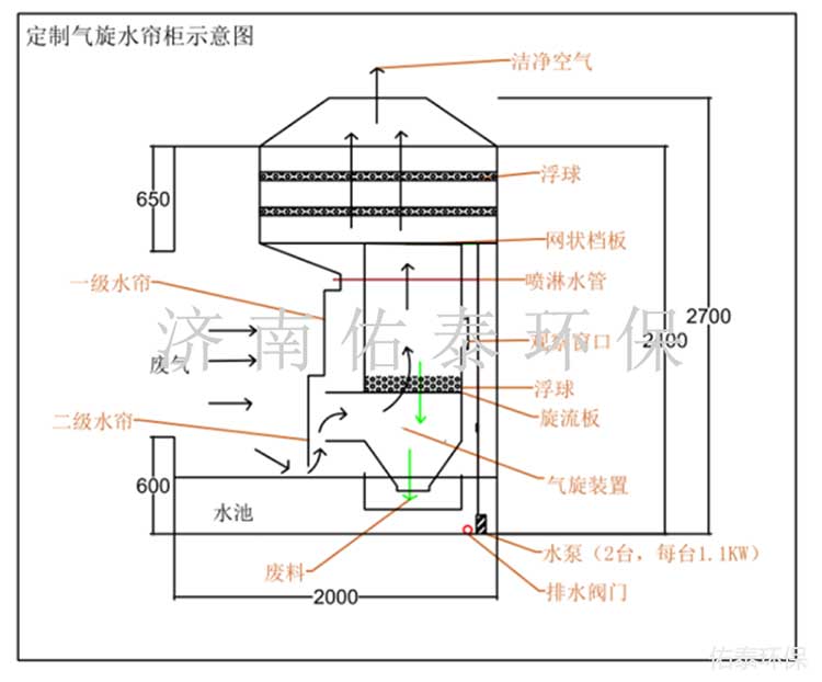 1、氣旋式噴漆水簾柜簡稱氣旋水簾柜,氣旋噴漆柜。該設備作業時,粉塵或廢氣在負壓風機牽引力的作用下,噴漆噴膠產生一部分乳化性廢氣顆粒隨水簾落到水池中,大部分廢料進入高速旋流導軌裝置,漆霧、旋風與水在高速旋轉的進行氣液乳化反應。氣動混流裝置的高速運轉,使得漆霧與旋轉液體充分混合,在離心力的作用下達到漆液分離。氣旋桶內部采用水泵循環給水,由安裝在隔水層底部的螺旋噴嘴噴出來,漆霧分離出來的粉塵顆粒物下沉到水箱底部,分離后的氣體進入環保填充料隔水層,然后進入后段的廢氣處理設備。