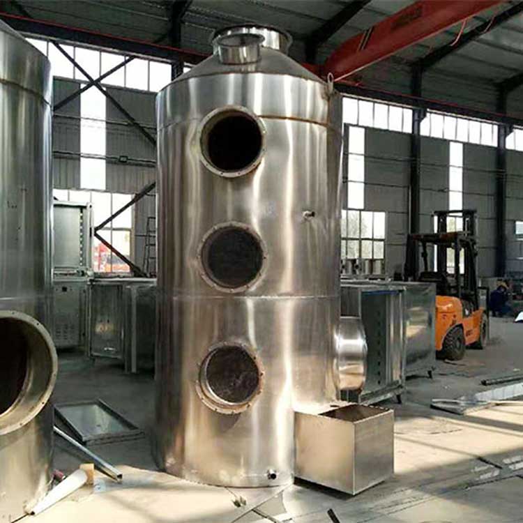 生產(chǎn)設(shè)備運(yùn)行過(guò)程中產(chǎn)生的廢氣通過(guò)管道由風(fēng)機(jī)引入不銹鋼噴淋塔,在噴淋塔內(nèi)多級(jí)噴淋的混流作用下,廢氣與塔體噴出的吸收液充分接觸。噴漆,SO2和NOx等有機(jī)廢氣被吸收液吸收,而廢氣和粉塵在離心力的作用下被甩到塔壁,被塔體內(nèi)壁的水膜粘附,然后隨吸收液流入沉淀池,定期清洗。凈化后的氣體經(jīng)氣體除霧層進(jìn)行氣液分離后,從高空煙囪排入大氣。