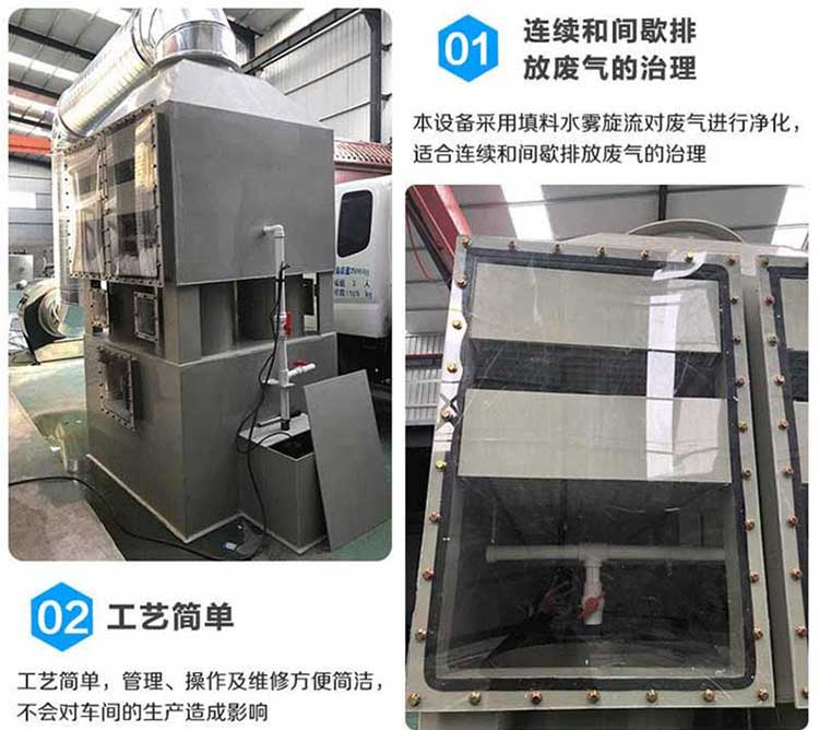 需要處理的含塵廢氣由風管引入凈化塔,經過旋流塔洗滌桶時,風帶加快,帶動填料球飛快運轉。在洗滌桶里,含塵廢氣與水霧充分混合洗滌,中和反應(水里補充有酸堿時)廢氣經過凈化后,再清除霧層脫水除霧后由風機排入大氣或再進入其他凈化設備(光氧催化、低溫等離子等)。吸收液在塔底輕水泵增壓后在箱頂噴淋霧化而下,***后回流直箱底循環使用,凈化的廢氣達到國家排放標準。