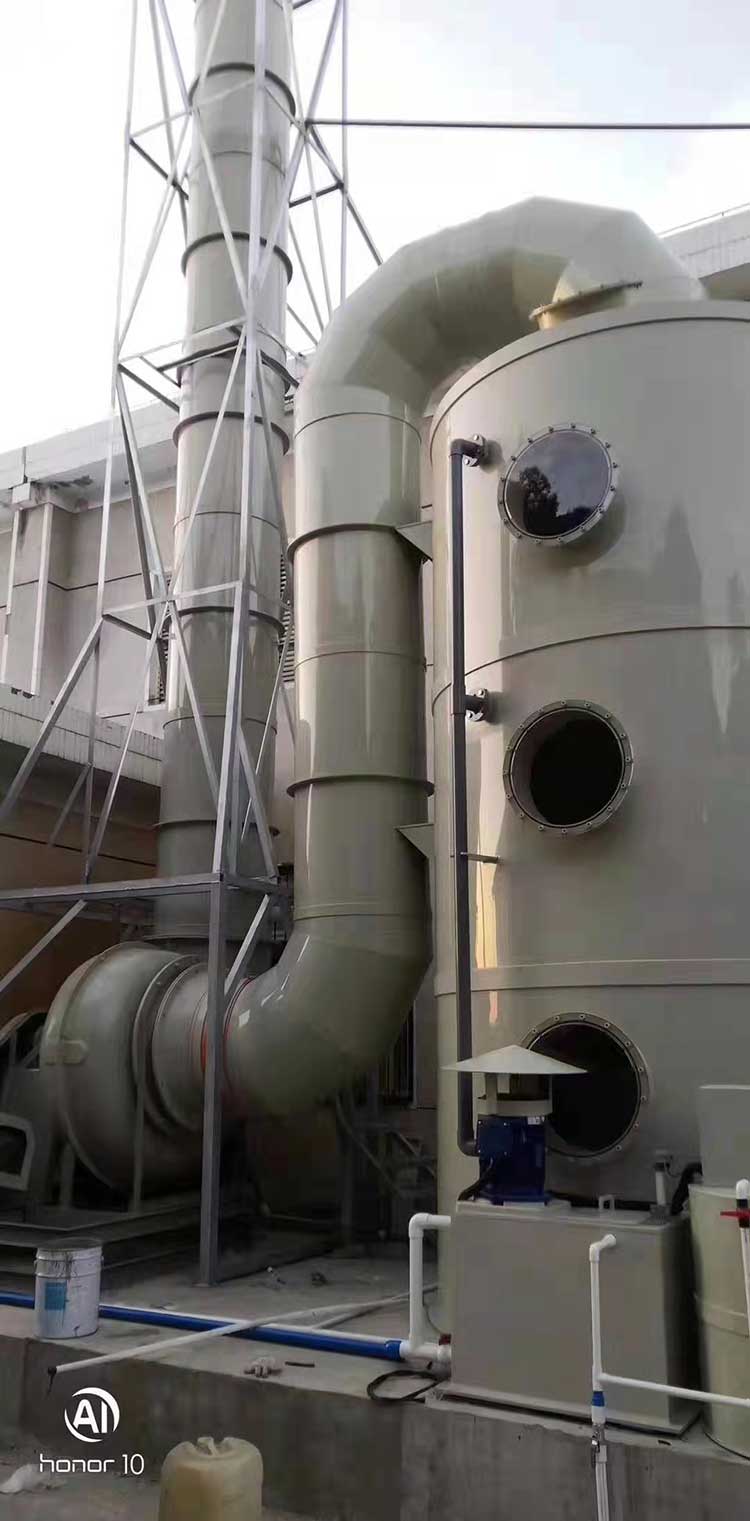 1.5萬(wàn)風(fēng)量pp噴淋塔塔規(guī)格為:ф1.8m*H4.0m*10mm。進(jìn)、出風(fēng)口直徑均為600mm。循環(huán)水量每小時(shí)22立方。每小時(shí)處理廢氣量15000立方左右。凈化塔整體厚度為8mm PP板。塔體內(nèi)部有二層水噴淋裝置,三層浮球填充,帶水箱和2.2KW純銅芯普通循環(huán)水泵。