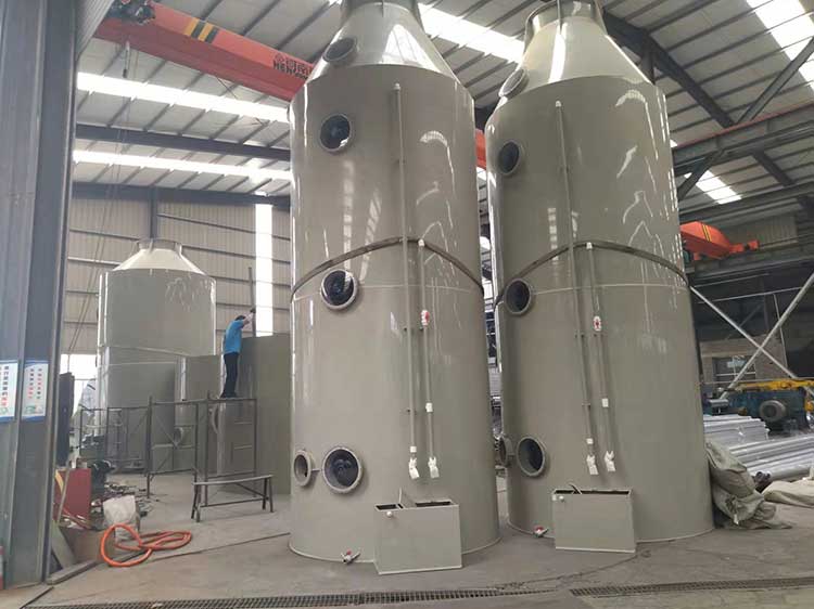 廢氣凈化塔利用氣體與液體間的接觸,而將氣體中的污染物傳送到液體中,然后再將清潔氣體與被污染的液體分離,達到清凈空氣的目的。廢氣經由廢氣凈化塔,采用氣液逆向吸收方式處理,即液體自塔頂向下以霧狀(或小液滴)噴撒而下。廢氣則由塔體(逆向流)達到氣液接觸之目的。此處理方可冷卻廢氣、調理氣體及去除顆粒,再經過除霧段處理后,排入大氣中。