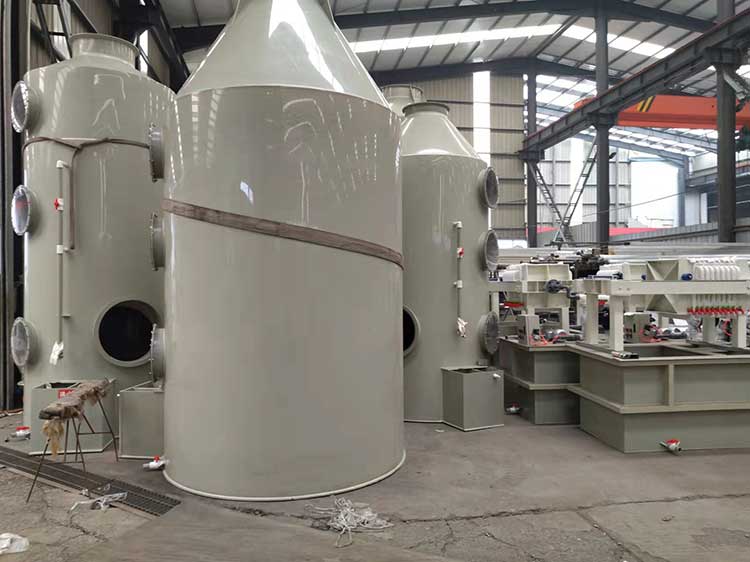 噴淋塔廢氣處理塔處理廢氣的方式如下,廢氣塔在運行中,不斷有機氣體由風(fēng)管引入噴淋塔,經(jīng)過填料層,廢氣與漆霧凝聚劑的稀釋劑進(jìn)行氣液兩相充分接觸吸收中和反應(yīng),有機氣體經(jīng)過凈化后,再經(jīng)除霧板脫水除霧后由風(fēng)機排入大氣。吸收液在塔底經(jīng)水泵增壓后在塔頂噴淋而下,較后回流至塔底循環(huán)使用。凈化后的有機氣體中,漆霧去除率達(dá)到95%以上,為后續(xù)處理噴漆廢氣中的甲苯,二甲苯等有機氣體提供良好工作條件。