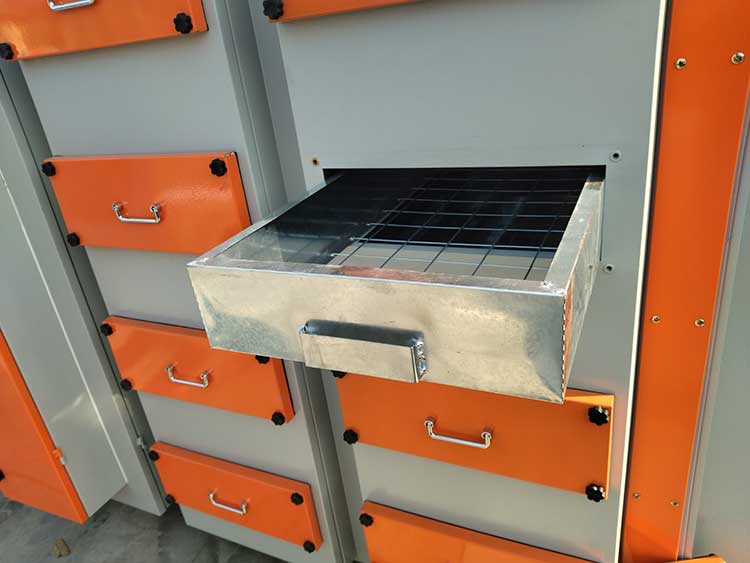 第二種:L2.0*W1.15*H1.7(m),1.5mm鍍鋅板制作,外表噴塑。共9個活性炭抽屜,360塊(L10*W10*H10)活性炭磚。進風口一道玻纖過濾網,出風口一道活性炭過濾棉。活性炭碘值400。