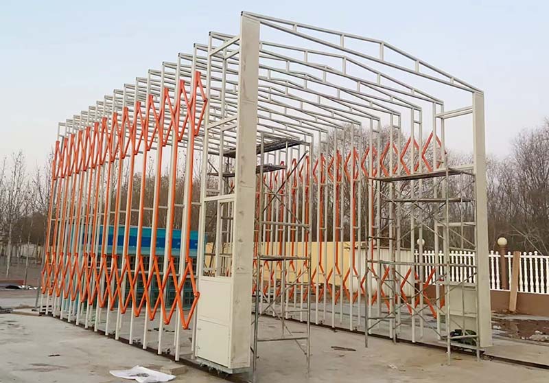伸縮房整體為鋼制框架結構,可前后伸縮移動。框架之間的滑動連接機構框架在驅動裝置的帶動下沿地面的軌道前后豎直平行移動,同時帶動蓬布展開合攏。移動室收縮合攏時,將工件移入工作區,展開時可進行工件的噴漆或打磨等工作。在不噴漆的工作時間內,可將移動區域合攏,騰出空間場地作為其他與噴漆交叉作業的工序使用。