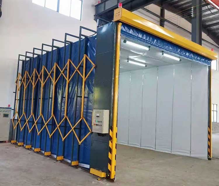 一、移動伸縮噴漆房又叫作伸縮噴漆房、移動噴漆房、伸縮式噴漆房。它是一種專業的涂裝設備,能滿足大型、異形涂裝工件噴漆作業過程中對環境的溫度、濕度、照度、潔凈度的需求;為操作工人提供良好的安全衛生環境。噴漆過程中產生的有機廢氣,通過治理后,使得涂裝作業的廢物排放達標,保護環境免遭污染。就是說為了使噴涂涂裝時產生的浮游涂料粒子及所包含的廢氣能夠及時從噴涂的現場清除,以達到提高涂裝質量,保護環境,維護操作人員的身體健康的目的。