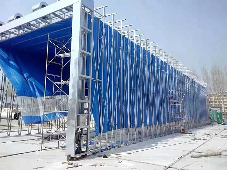 3、伸縮移動噴漆房整體為框架傳動結構,每組框架間均有阻燃PVC布密封連接,安裝快捷、外形美觀,結構精巧,使用方便,制造成本低,節約投資;