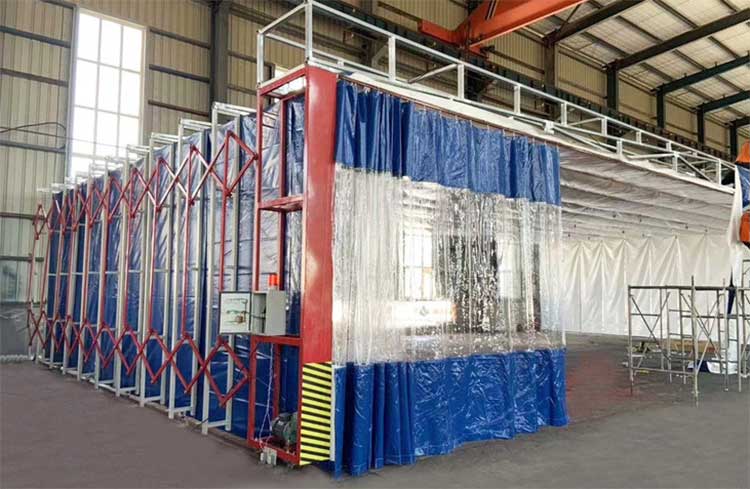 5、安裝位置:伸縮噴漆房安裝位置非常重要,選選擇通風狀況良好的位置,隨時能保證新鮮空氣的供給,保證噴漆房能正常工作、發揮作用;其次是附近不能有明火作業或火災隱患的工作場所,保證噴漆房使用安全。